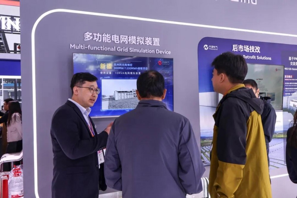 除风光储氢等核心装备外,禾望电气还提供500kvar~150Mvar多功能电网模拟装置,协助新能源场站开展电网适应性、电网故障穿越、电网支撑性等设备特性测试。该系列产品已在多个场景中实现重要突破,包括全球首家90MVA大容量电网模拟装置应用、全球首例主力电源型风电场应用、国内首个主力电源光伏场站应用、国内首个宽频带阻抗测量功能产品化应用等。在新能源场站,禾望电气还为客户提供后市场改造服务,涵盖风电变流器改造、风电变桨改造以及光伏逆变器改造等解决方案,有效帮助老旧场站解决故障率较高、备件采购难、维护成本高、不满足最新电网标准等困扰。