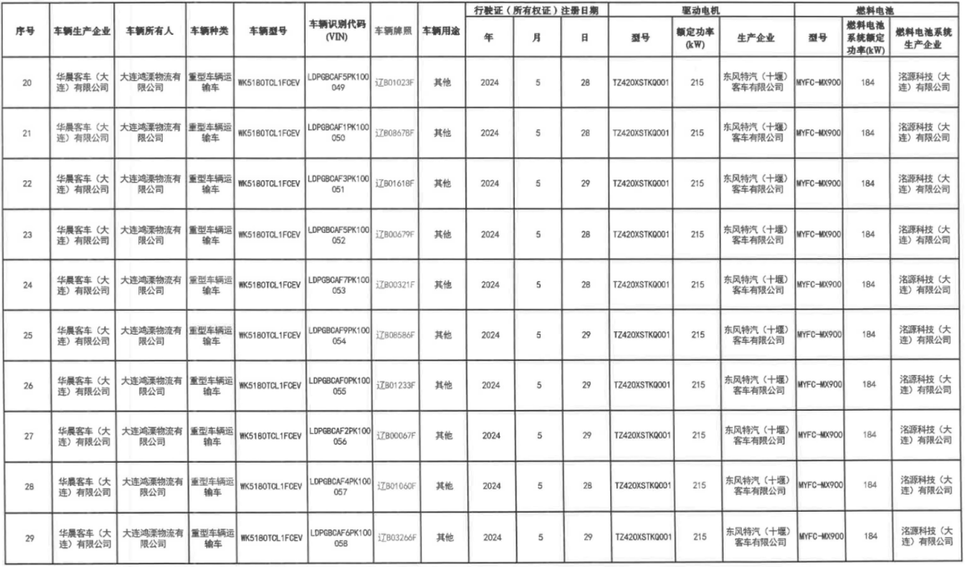 车辆种类涉及重型车辆运输车、大型普通客车、轻型厢式货车、燃料电池大中型客车、燃料电池洗扫车、燃料电池吸尘车。